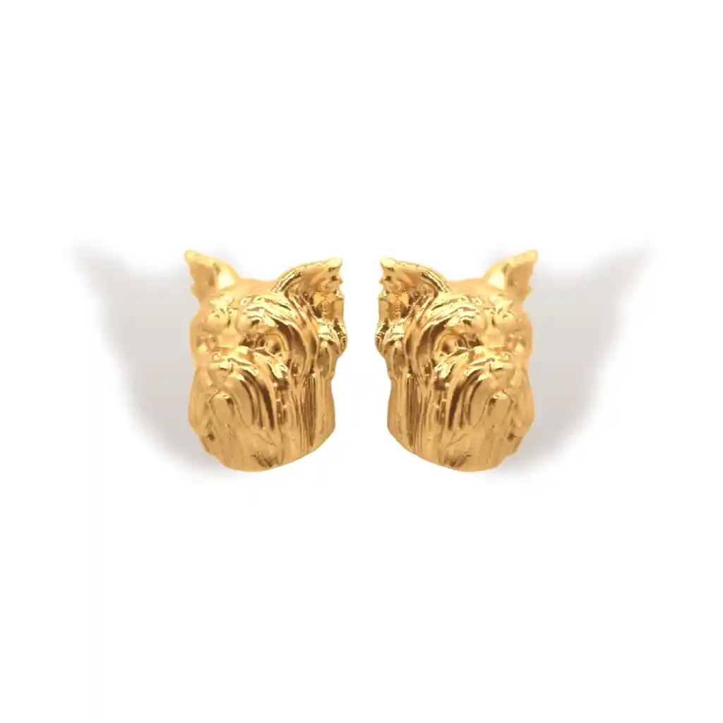 Encarna la dulzura y la lealtad de nuestros aretes tipo topo, inspirados en los encantadores Yorkshire Terrier, esos fieles amigos que alegran nuestros días. Cada par de estos adorables aretes está meticulosamente elaborado en bronce y adornado con un baño de oro de 24 kilates, asegurando un brillo duradero y un estilo atemporal.