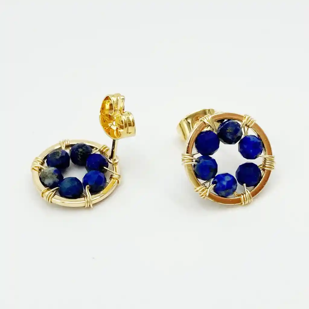 Aretes de dorados de bronce con baño de oro de 18k. Entorchado a mano con piedras Lapislázuli naturales. Diametro del círculo 1,2cm.