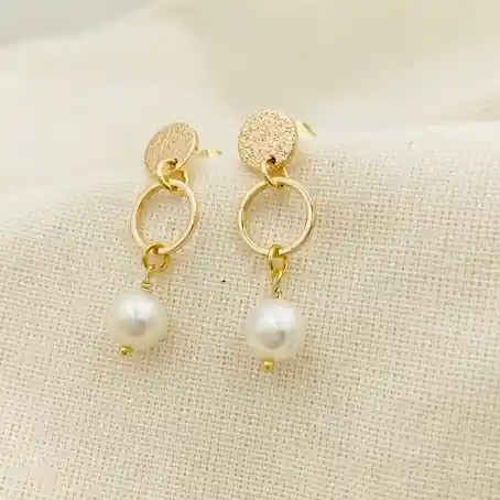 Aros Caroco argollita y disco textura dorados con una perla mini natural. Bronce con baño de oro de 18k libre de níquel. 2,5cm de largo total.