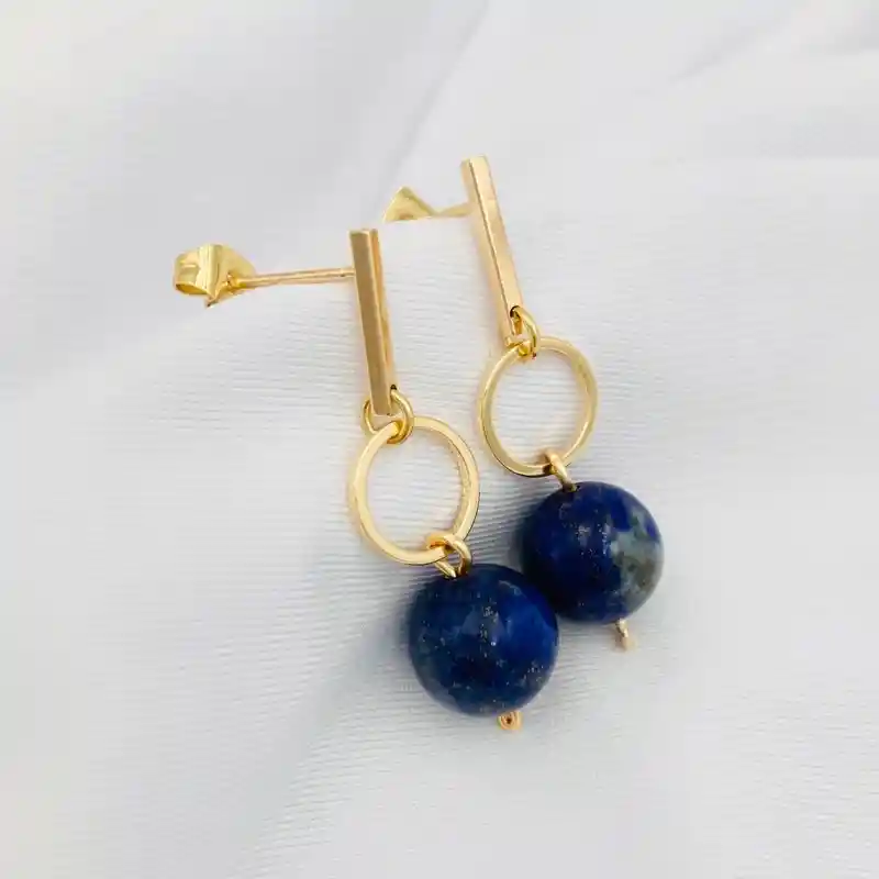 Aretes Caroco dorados con piedra Lapislazuli natural de 1cm. Palito y argolla dorados de bronce con baño de oro de 18k. Largo total de los aretes: 3,6cm.