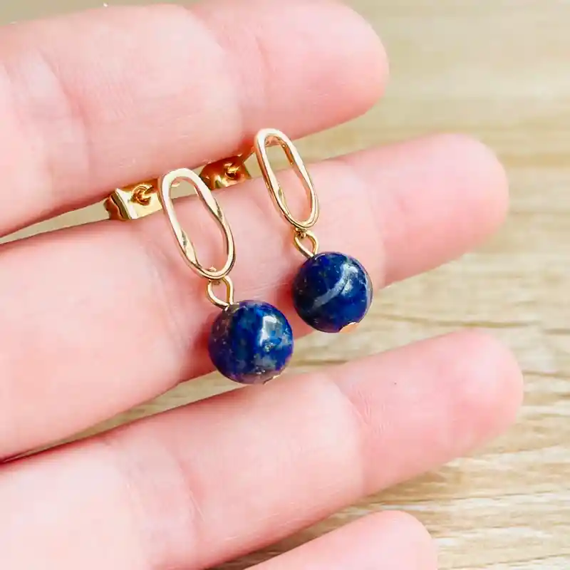 Aretes con una figura ovalada irregular, dorados y brillantes, de bronce con baño de oro. Una piedra Lapislázuli natural. Largo total 2,4cm.