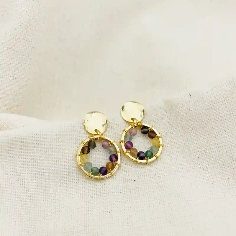 Aretes ¨Lirio¨ de piedras Fluorita, de la marca Caroco con piedras naturales entorchadas a mano con alambre dorado. Material: bronce con baño de oro de 18k. Los aretes miden 3,3cm de largo total.