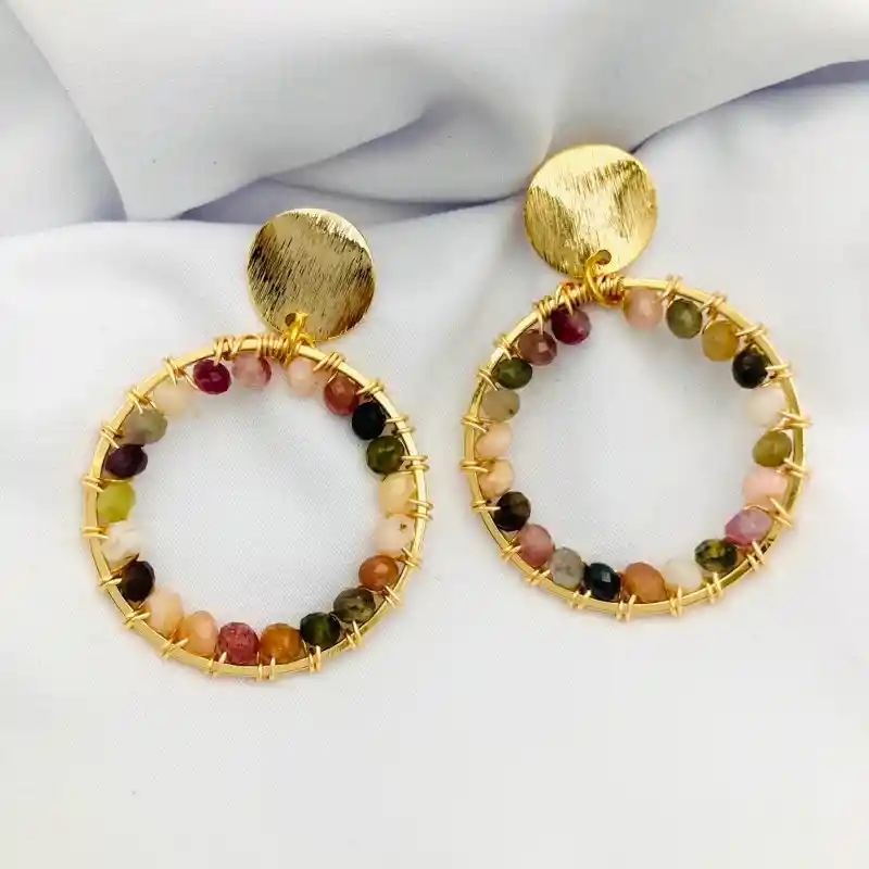 Aretes Caroco, "Sol de piedras Turmalina" en un mix colores entorchadas a una argolla de 3cm con un disco rayado de curvas, todo con baño de oro de 18k. El largo total de los aretes es de 4,5cm.