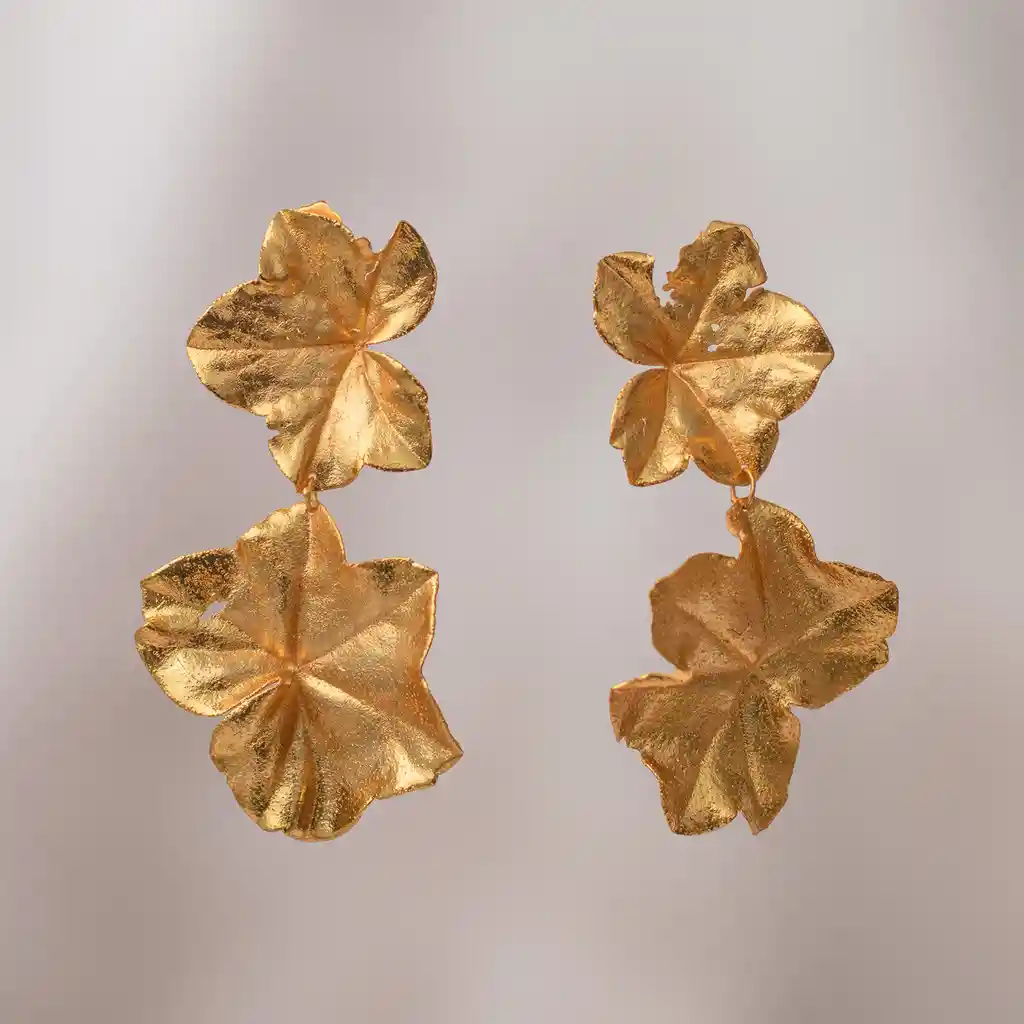 Estos aretes inmortalizan la unión de dos hojas de Hiedra reales bajo un baño de oro. Su diseño articulado permite que la hoja inferior baile con tu movimiento, reflejando la luz en sus texturas venosas y orgánicas. Al nacer de la planta genuina, preservamos sus "perfectas imperfecciones": cada grieta y contorno irregular de la hoja original queda intacto en el metal. Son piezas con carácter, ideales para quienes buscan una joya que simbolice la fidelidad y la fuerza de la naturaleza en un formato statement (llamativo). Nota: La naturaleza artesanal de estos aretes garantiza que cada par sea único en su forma y detalle.