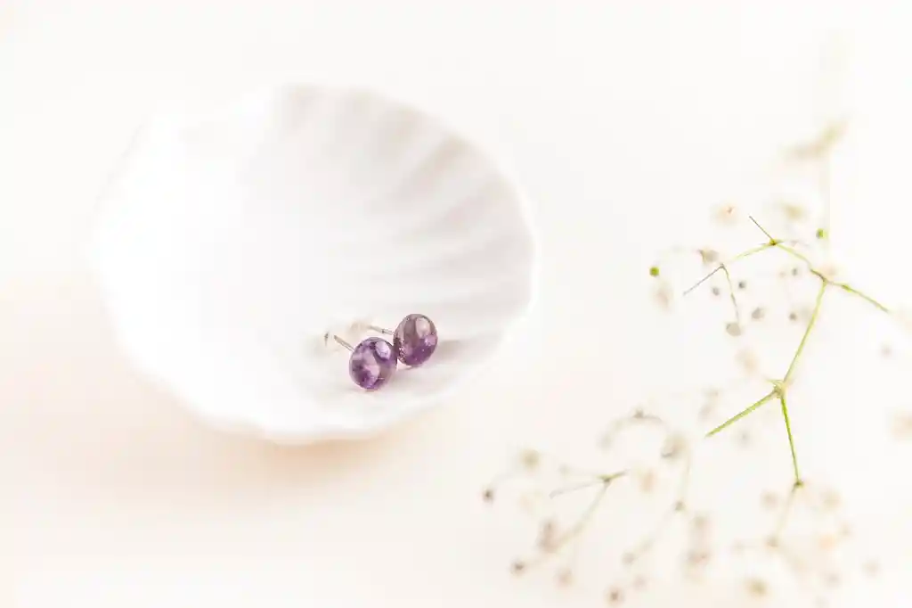 Aretes en cabujón de cuarzo y pieza trasera en acero inoxidable. Medidas: 1 cm diámetro.