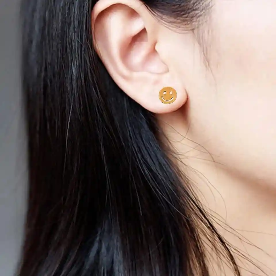 Presentación: Arete Topo (Cierre Mariposa) Material: Acero Quirúrgico Color:Dorado Diseño: Cara Feliz Mediano Producto Hipoalergénico. Tamaño 1 cm Caracteristicas: Es un material que no se oxida, no se oscurece con el tiempo, su tonalidad y brillo no se alteran. Es Antialérgico, la cantidad de níquel que tiene es residual por lo que en rarisimas ocasiones causa alergias. No necesita mantenimiento. Es un material duro, 1000 veces más duro que el platino y no se deforma.