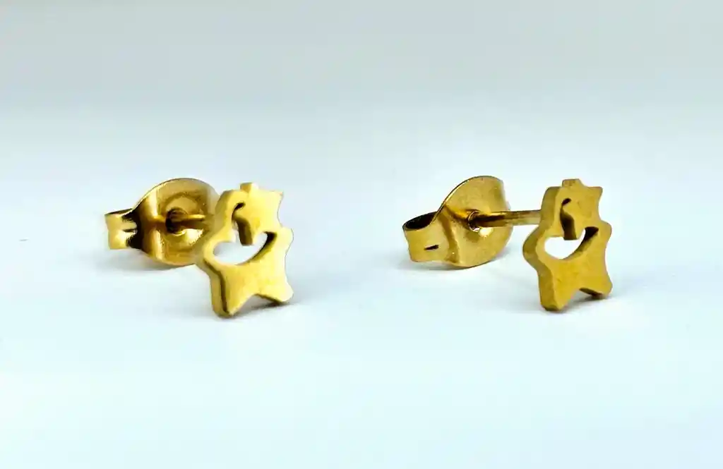 Presentación: Tipo Topo (Cierre Mariposa) Material: Acero Quirúrgico Color: Dorada Diseño: Estrella Doble Producto Hipoalergénico. Tamaño 1 cm Caracteristicas: Es un material que no se oxida, no se oscurece con el tiempo, su tonalidad y brillo no se alteran. Es Antialérgico, la cantidad de níquel que tiene es residual por lo que en rarisimas ocasiones causa alergias. No necesita mantenimiento. Es un material duro, 1000 veces más duro que el platino y no se deforma.