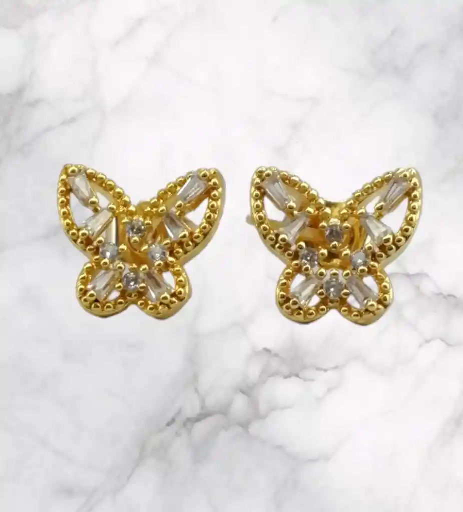 Presentación: Tipo Topo (Cierre Mariposa) Material: Acero Quirúrgico Color: Dorada Diseño: Mariposa con circones Producto Hipoalergénico. Caracteristicas: Es un material que no se oxida, no se oscurece con el tiempo, su tonalidad y brillo no se alteran. Es Antialérgico, la cantidad de níquel que tiene es residual por lo que en rarisimas ocasiones causa alergias. No necesita mantenimiento. Es un material duro, 1000 veces más duro que el platino y no se deforma.