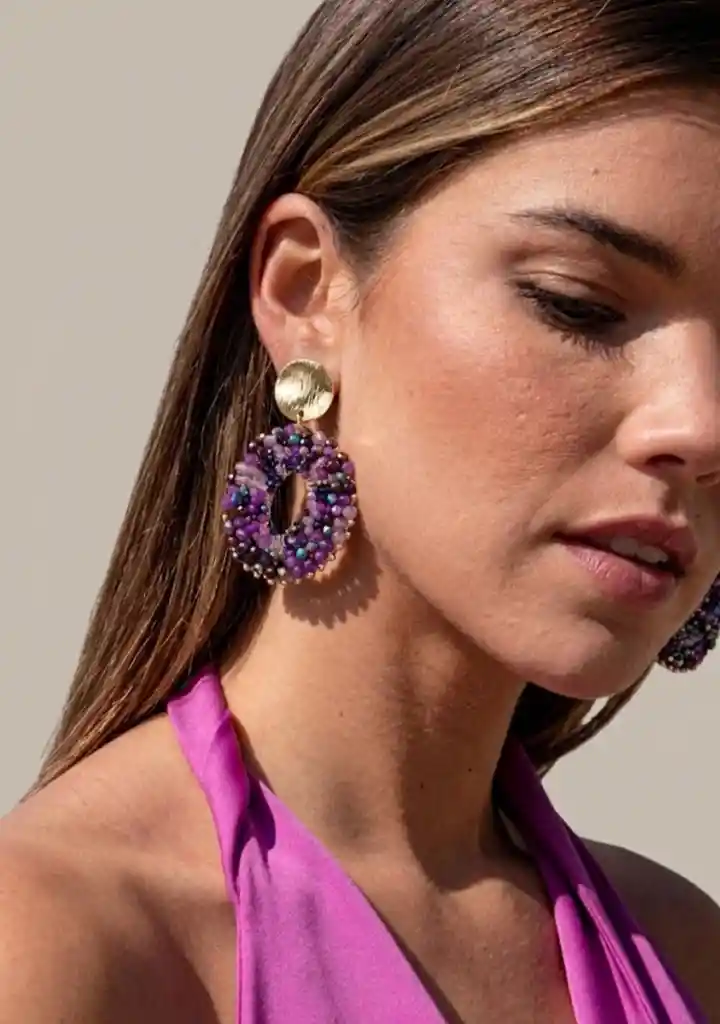 Maxi aretes elegantes en cristal de murano en tonos morados con acabado brillante y diseño moderno. Ideales para uso diario o para ocasiones especiales.