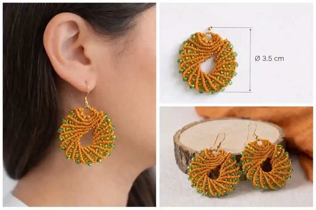 ✨ Espiral Melverde ✨ Déjate envolver por la dulzura y la armonía. Cada par de estos aretes ha sido tejido a mano en fino hilo encerado, con la técnica del micro macramé, dando forma a una espiral que simboliza el crecimiento y la energía vital. Su cálido tono miel, combinado con delicados destellos, ilumina el rostro con elegancia natural. El aro y los pendientes tipo pescador en acero inoxidable garantizan durabilidad y confort, mientras su altura de 5 cm solo la parte tejida, hace ligeros y perfectos para usar todos los días o en ocasiones especiales. Los tonos pueden variar levemente respecto a la fotografía, ya que la iluminación y la cámara influyen en la percepción del color 🎨 🍯 Espiral Miel: un toque artesanal, elegante y lleno de luz.