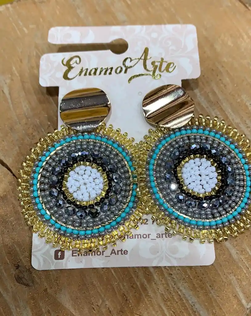 Aretes artesanales, enamorarte, tejidos en mostacilla, oro golfi brasilero.