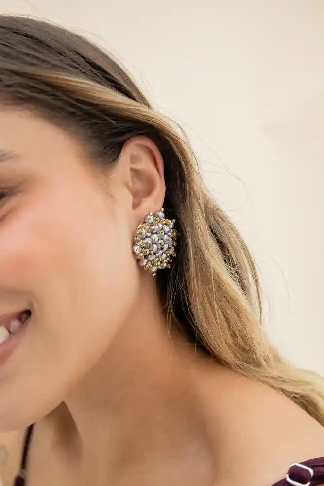 Aretes elaborados en Bronce con baño de oro de 24k y tejido en múranos. Incluye: 1 par de aretes redondos gris. Recibe con tu compra una FLORIBAG gratis, para que guardes por separado tus accesorios. Hecho a mano en Colombia. * Ten presente que algunas de las imágenes pueden estar ambientadas con otros productos que se venden por separado.