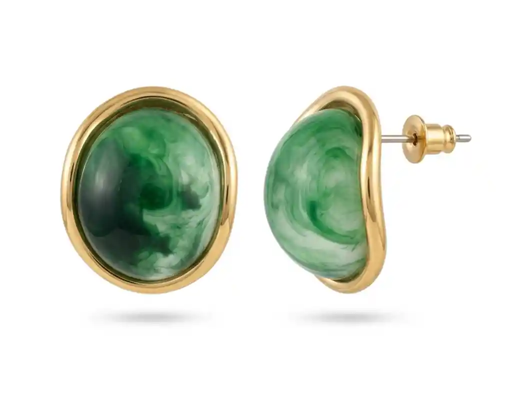 Un diseño clásico y sofisticado con centro tipo jade marmoleado y borde en acero inoxidable dorado. Son ligeros, hipoalergénicos y perfectos para darle un toque de clase y color vibrante a cualquier outfit.