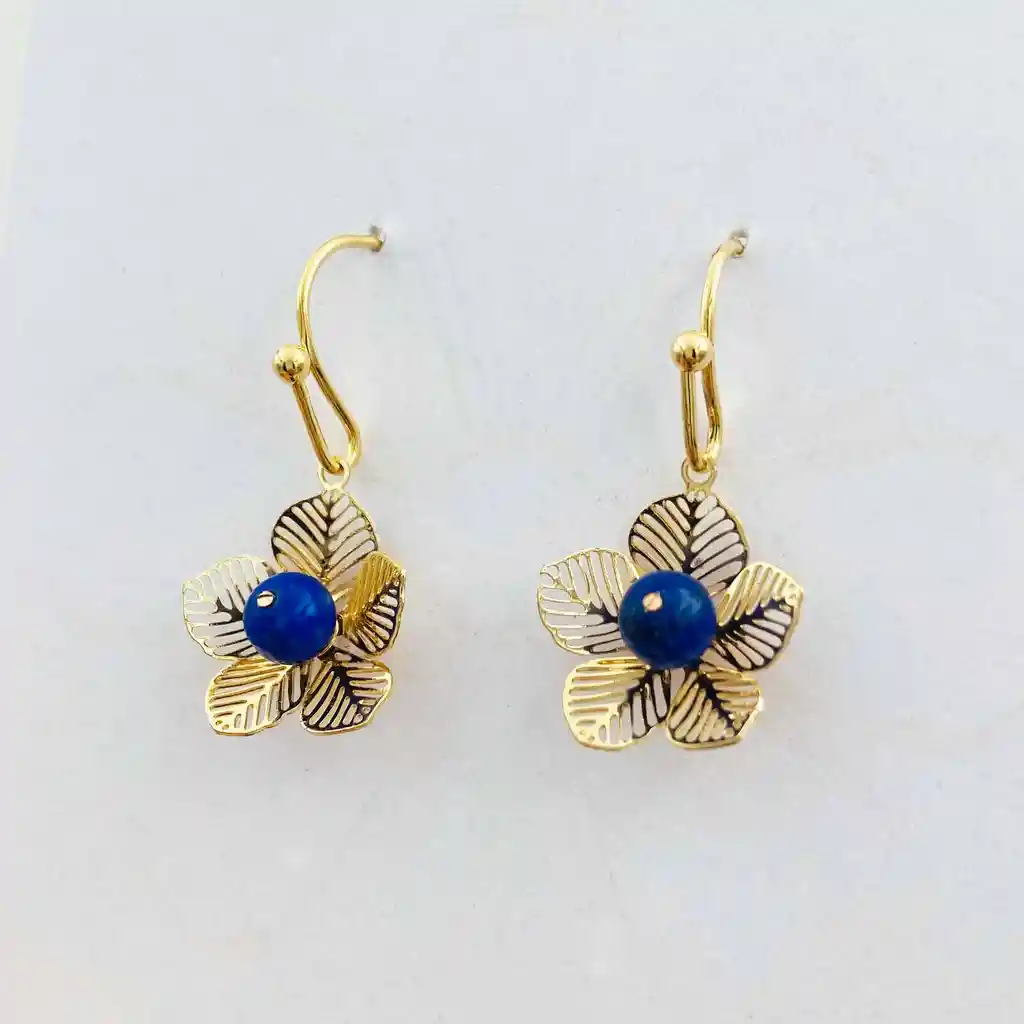 Aretes Caroco, ganchito y flor filigrana delgadita, Lapislazuli, baño de oro, 2,4cm de largo