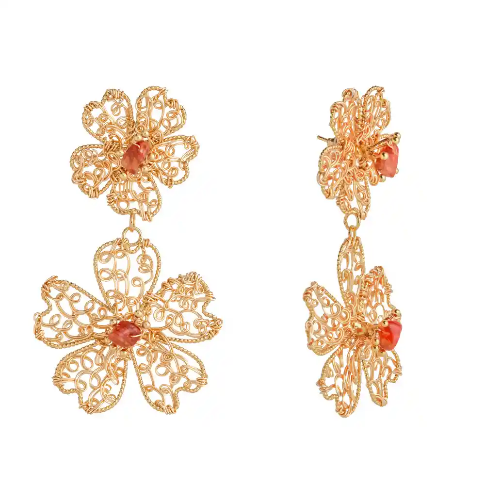 MARIA RESTREPO ENIGMA JOYERÍA Dos flores con alambrados hechos a mano por mujeres colombianas artesanas, con color y tamaños que se complementan perfecto. Definitivamente son un par de aretes infaltables, llenos de poder, brillo y presencia. ¡Lleva toda la atención al rostro y brilla con ellas! • Aretes en bronce con baño oro 24k • Medidas: Largo 7,8 cm, Ancho 4,7 cm, Alto 2,4 cm • Peso en gramos: 11,4g CUIDADOS • Evita el contacto directo con cremas, perfumes, splash, lacas, tinturas, bronceadores, cloro y alcohol. • Guarde cada producto en su empaque individual para evitar rayones, enredos, cambio de forma o desgaste en acabados. • Evite el contacto con agua de mar y agua de piscina. • Evite caídas, golpes o manipulación fuerte del producto. GARANTÍA • Garantía en tiendas físicas y plataformas Online.