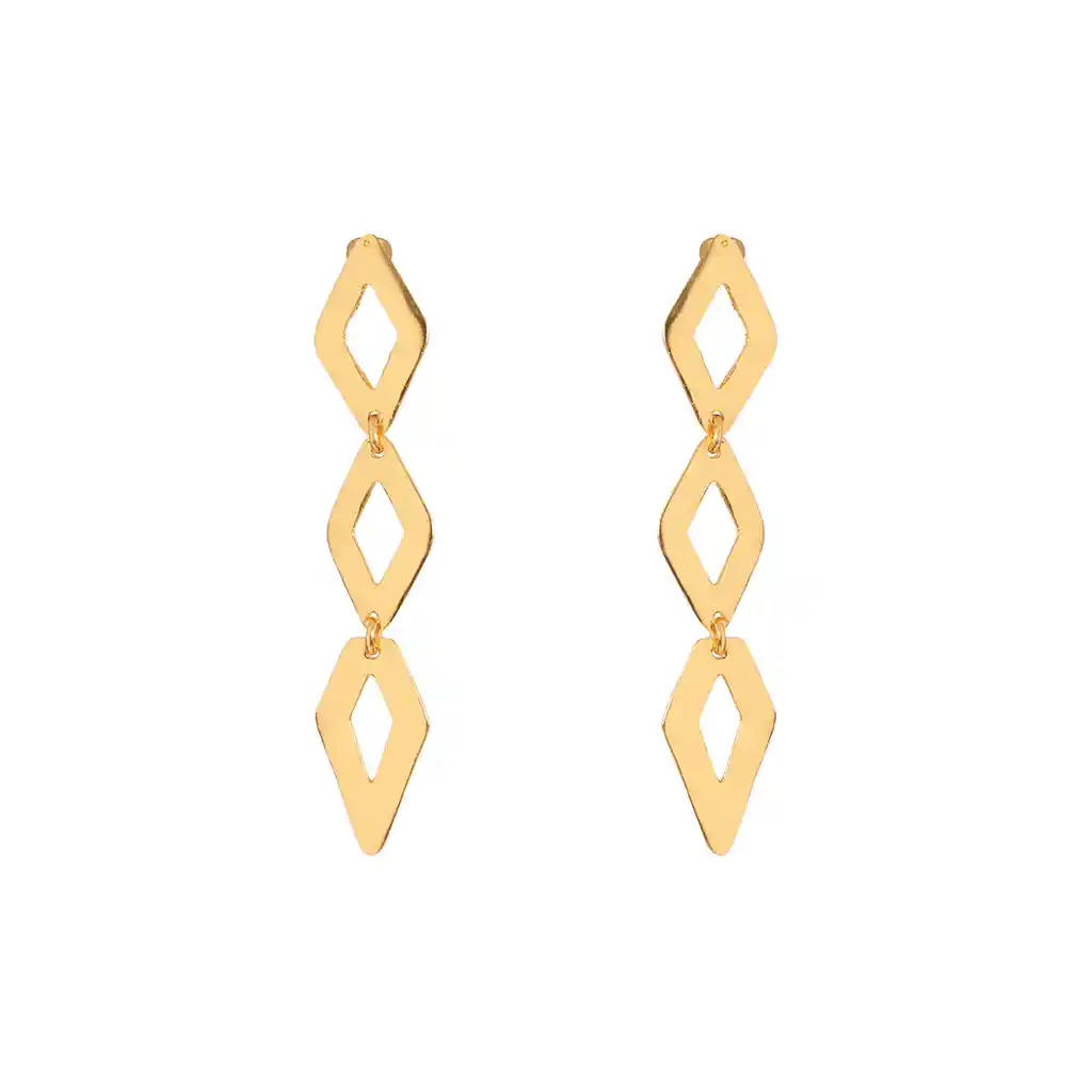 Aretes elaborados a mano con técnicas artesanales, base de bronce y baño de oro. Nuestra colección abstract llega con figuras inspiradas en patrones representativos de la Cultura Wayuu. Esta cascada en rombos representa el poder femenino y la fuerza de la mujer Wayuu, ejemplo de independencia, fortaleza y sabiduría. Cuidados de tus joyas: Almacenar las joyas en un lugar seco. Para conservar tu pieza te aconsejamos quitártelos si te metes al Mar o a la piscina. Evitar el contacto con aceites, perfumes y otros cosméticos. No utilizar productos químicos abrasivos o a base de alcohol para limpiar las joyas. Un poco de agua tibia y un paño suave son suficientes. Guardar