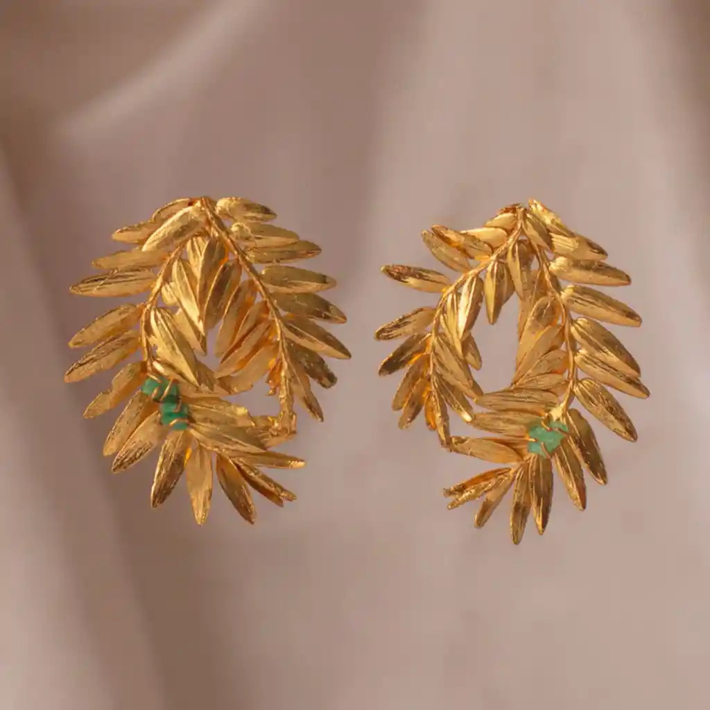 Los Aretes Rama de Helecho Romeron natural en espiral con esmeralda, inmortalizado en bronce y enchapado en oro de 24 Kilates y protección en laca cataforética (evita daños por el tiempo y el ambiente), son una mirada al mundo encantado de los Helechos. Joyas Inmortalizadas hechas a mano por artesanos Colombianos La imagen es de referencia y el producto final puede tener variaciones mas que todo en forma y tamaño, debido a que cada joya se realiza con una pieza original natural. No utilizamos moldes. #SomosNaturalezaViva. Joyas Naturales, Joyas Inmortalizadas, Naturaleza Colombiana Inmortalizada. Material: Rama de Helecho natural con esmeralda recubierto en cobre puro y enchapado en oro de 24 kilates