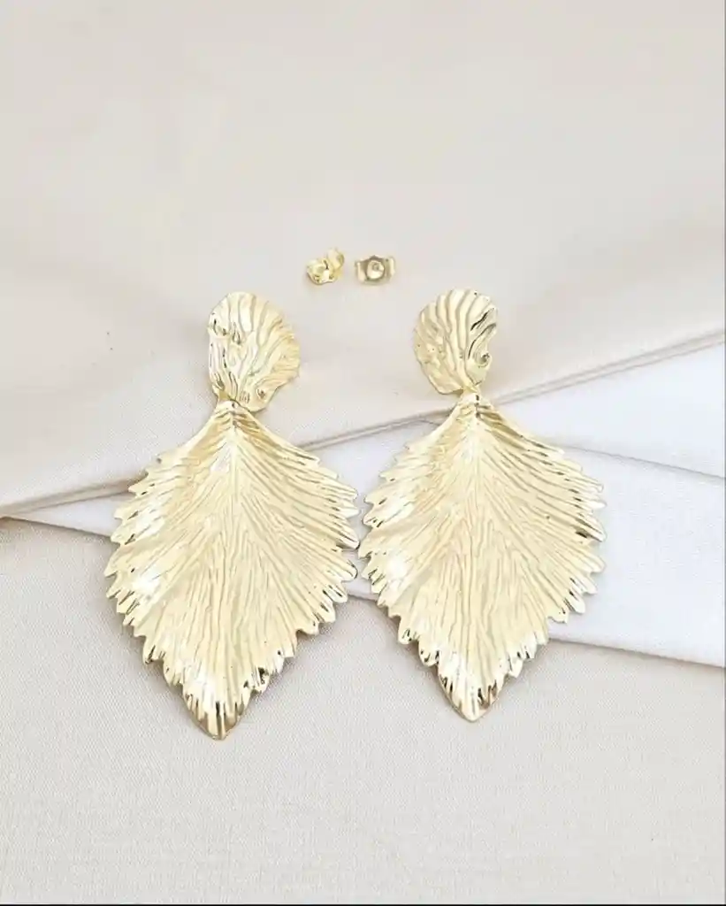 Par de aretes grandes en forma de hoja color dorado material rodio.