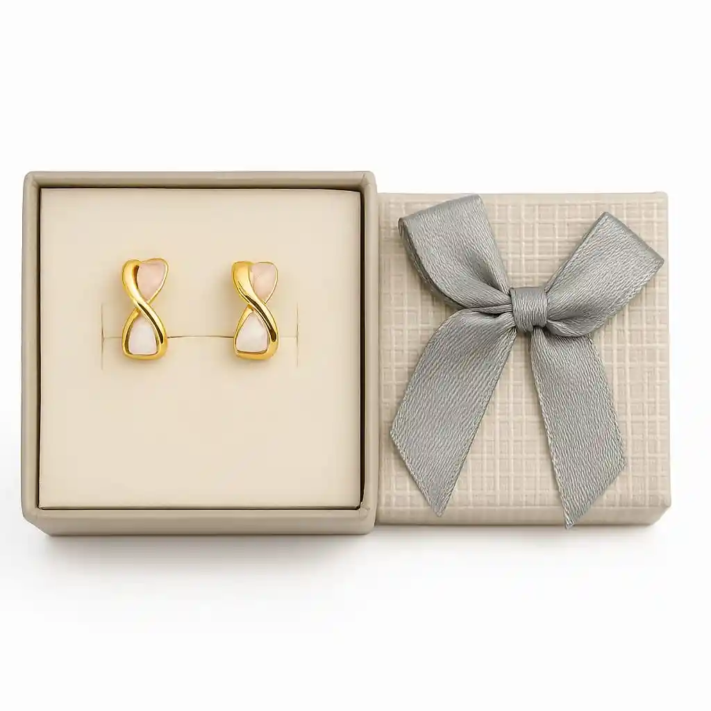 Sorprende a esa persona especial con un símbolo eterno. Estos delicados aretes bañados en rodio dorado con diseño de infinito y detalles en nácar son el detalle perfecto para expresar amor, gratitud o amistad duradera. Vienen en una hermosa caja de regalo lista para entregar.