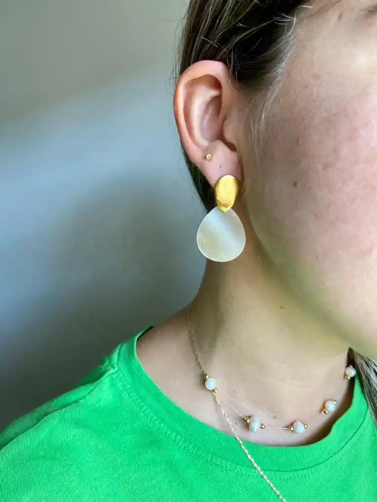 Hermosos Aretes elaborados con topo en Bronce con baño de 18kl y piedra Natural Nacar en forma de Lagrima.