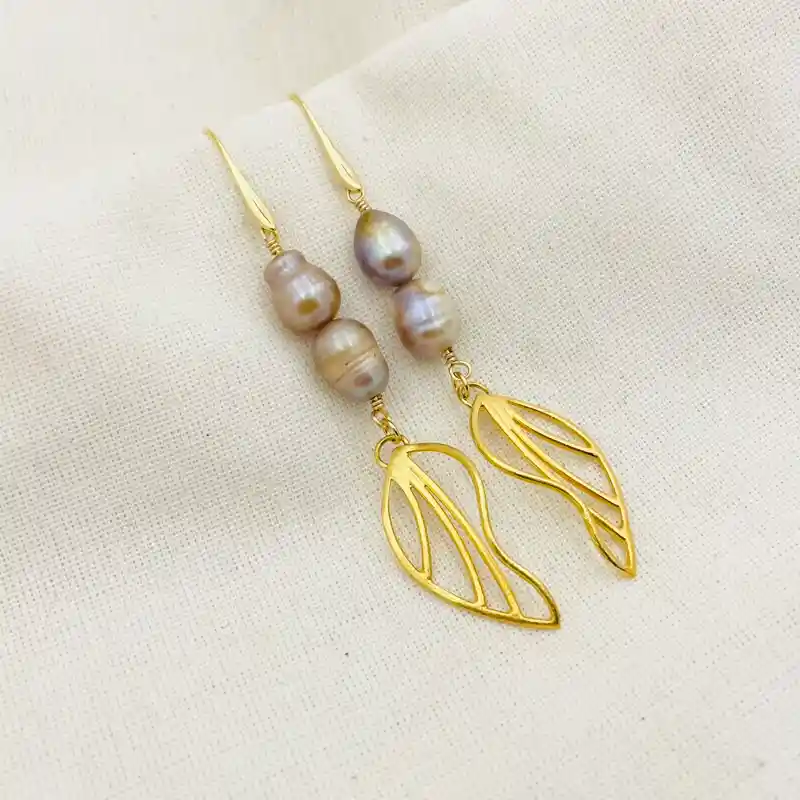 Aretes de hojas de Crisantemo doradas con perlas naturales color palo de rosa, diseño Caroco. Los aretes miden 7,5cm de largo total.