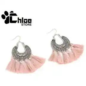 Aretes Largo Redondo Con Flecos Rosado