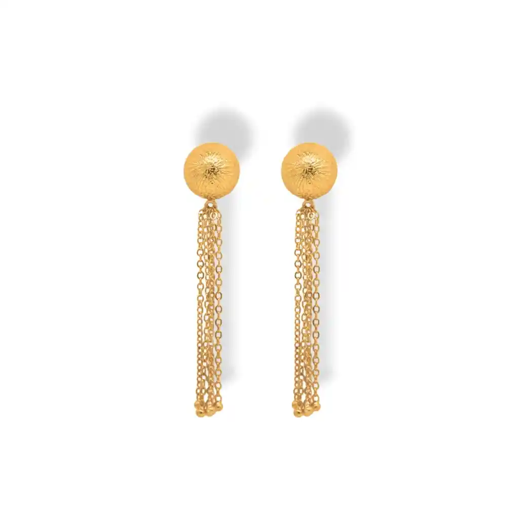 Los aretes largos con cinco cadenas elaborados en bronce reciclado y con baño en oro de 24k o plata son un accesorio elegante y moderno, perfecto para quienes buscan añadir movimiento y sofisticación a su estilo. Este diseño combina sostenibilidad con lujo, haciendo que cada pieza sea única y responsable con el medio ambiente. Material: Bronce reciclado con baño de oro 💎 de 24 kilates o plata🤩 Medida📏: La bola mide 1,5 cm de diámetro. El arete mide 8,0 cm de largo aproximadamente. *Recuerda que este es un producto artesanal, por esto es posible que pueda presentar variaciones a las medidas anteriormente mencionadas, hasta un rango del 15% aproximadamente. Peso🏋🏻♀️: 6,5 gr *Recuerda que este es un producto artesanal, por esto es posible que pueda presentar variaciones al peso anteriormente mencionado hasta un rango del 15% aproximadamente. Cuidados 🫶🏻: Para mantener tu joya como nueva 🤪 debes tener especial cuidado para no aplicarte perfume, cremas o demás productos sobre la piel con ella puesta, pues su color puede verse deteriorado. También es importante que la guardes en un lugar seco y amplio donde no haya posibilidades de dañar su forma ✨