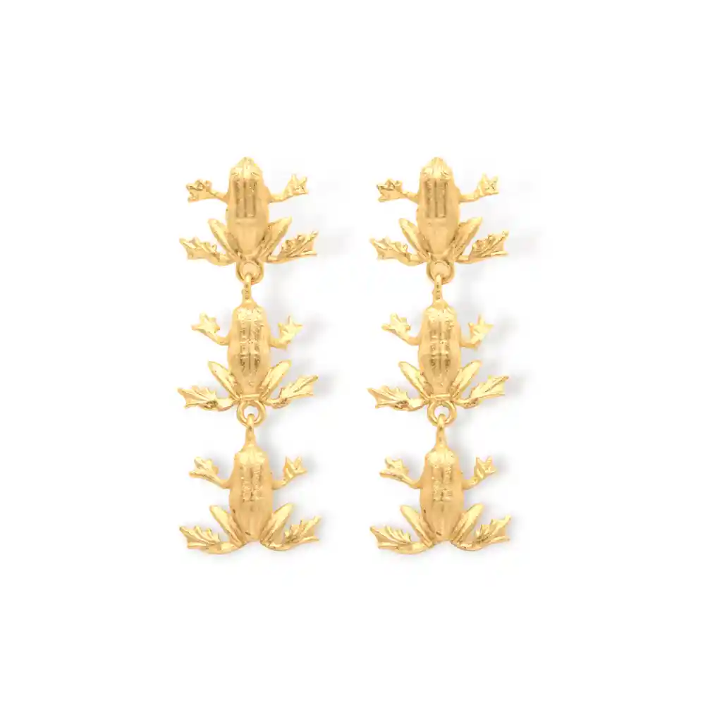 ¡Estos son los aretes perfectos para cualquier evento! Hechos con amor y cuidado en Colombia. Hechos a mano por artesanos que se enorgullecen de su trabajo, siendo cada pieza diferente a las demás. ¡Su detallado diseño está hecho de bronce bañado en oro de 24 kilates, lo que lo convierte en una pieza especial que puede usarse todos los días! Son tres ranas soldadas entre sí, creando una pieza ESPECTACULAR.