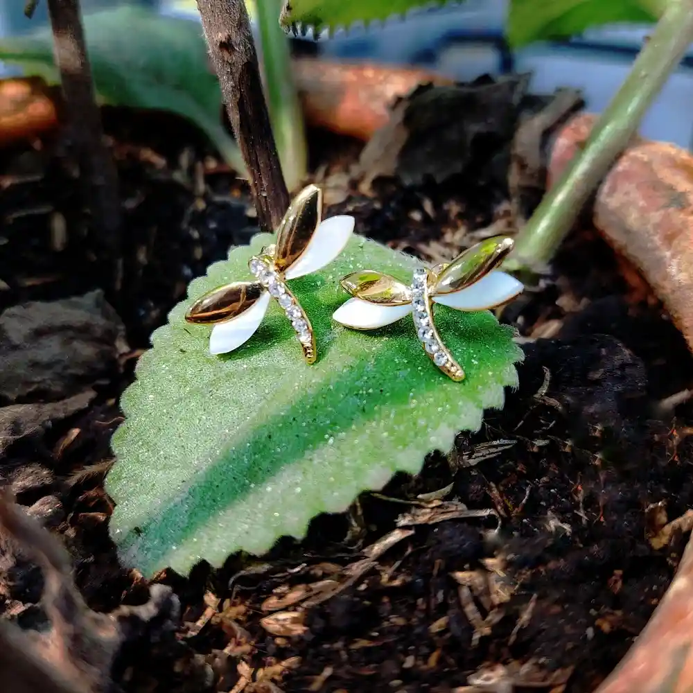 Topos con figura de libélula y piedras en blanco y dorado. Baño de Oro de 24K.