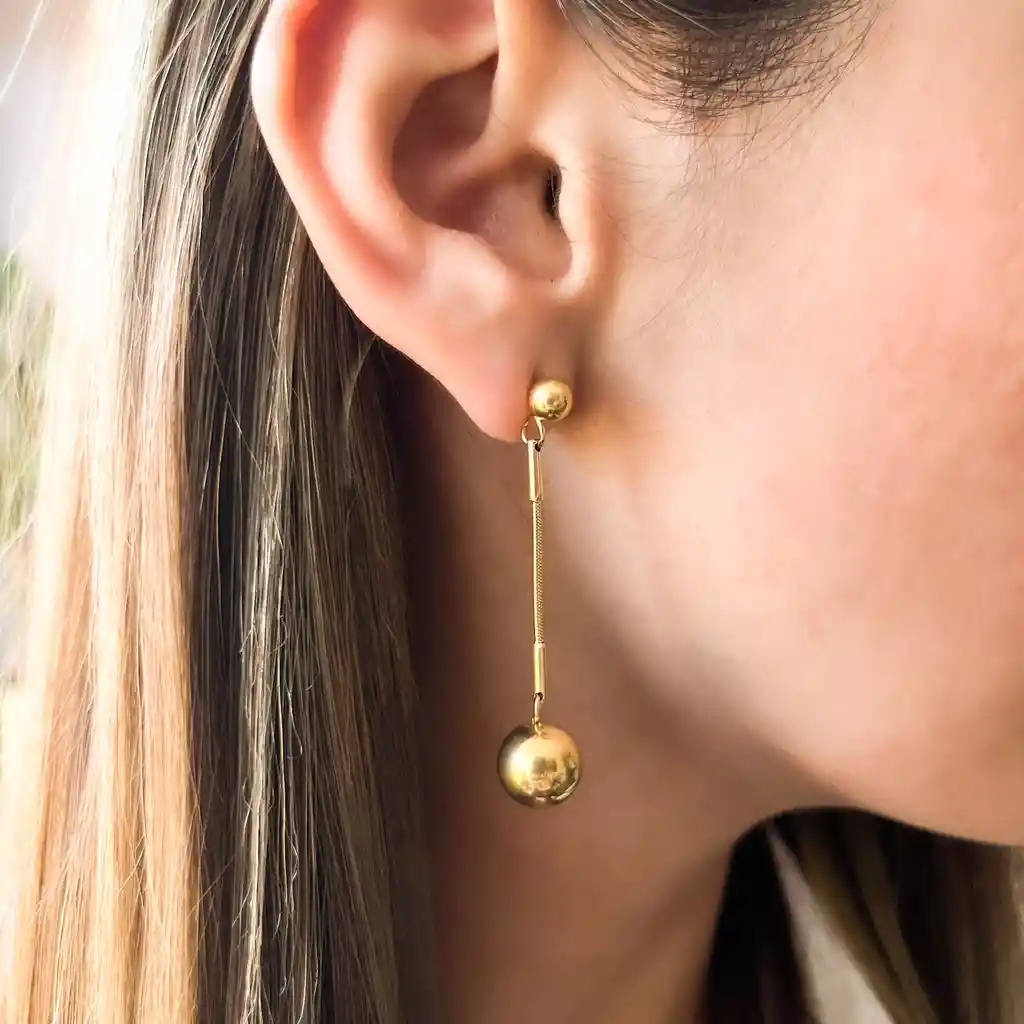 Aretes Esfera Colgante Acero Titanio con baño de oro de 18k Recomendaciones y cuidados: Para preservar el color te recomendamos no entrar a piscinas o el mar, tampoco aplicar líquidos y químicos tóxicos(perfumes, splash, cremas, alcohol, etc) Almacena tus joyas en los empaques de tela entregados con tus productos. POETRY no garantiza que el baño de oro y cualquier material de nuestros modelos dure para siempre. Las piezas bañadas y chapadas en oro, acero inoxidable, acero titanio, son por defecto, más frágiles y susceptibles de perder el color con el paso del tiempo.