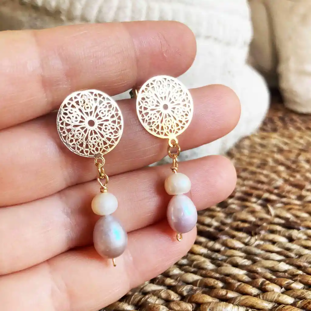 Aretes dorados de bronce con baño de oro en forma de mandala con 2 perlas colgantes.