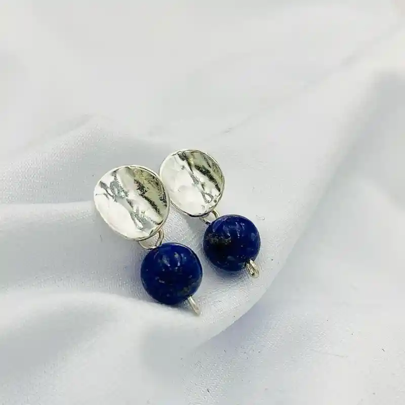 Aretes Caroco mini, de plata martillada con piedra Lapislazuli natural. Un disco ondulado de 8mm. de diámetro, y una piedra de 6mm. Largo total de los aretes 1,8cm.