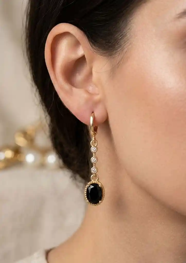 Los “Aretes Noche Elegante” son una pieza sofisticada en tono dorado con delicadas líneas de cristales que descienden hasta una piedra negra central de corte ovalado. Su diseño estiliza y aporta un brillo sutil, simbolizando firmeza, elegancia y seguridad. “El Señor es mi luz y mi salvación ¿de quién temeré?” — Salmo 27:1 Unos aretes que reflejan confianza y carácter, perfectos para brillar con determinación y gracia en cada ocasión. ✨🖤