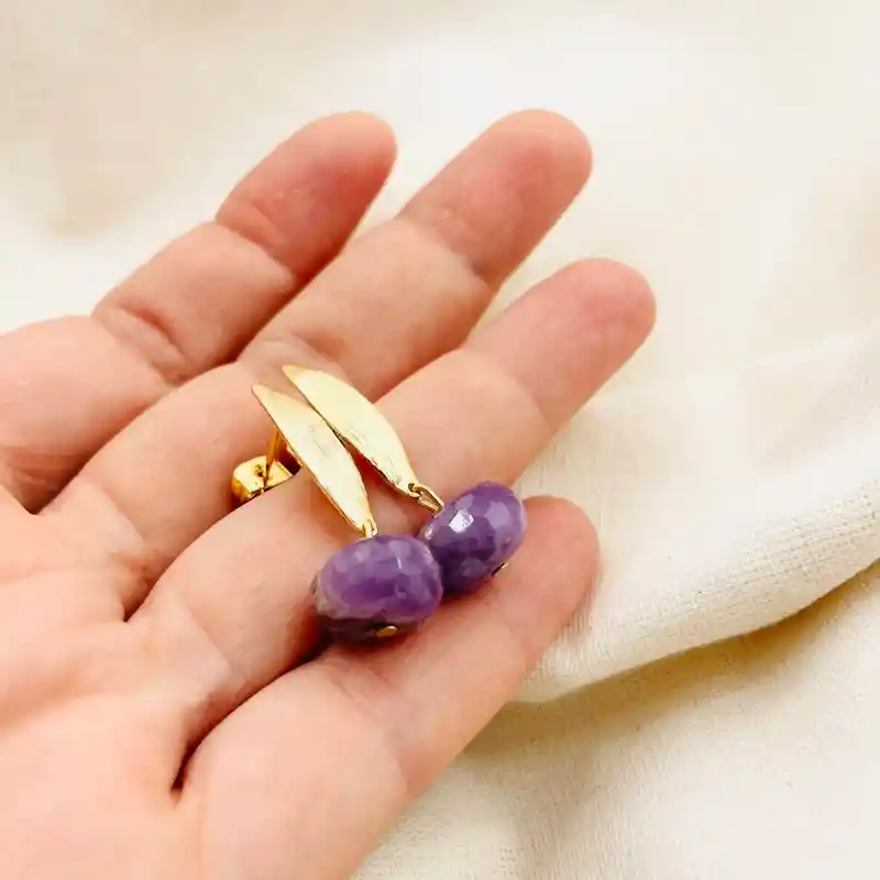 Aretes ojitos con textura dorados piedra Amatista natural.