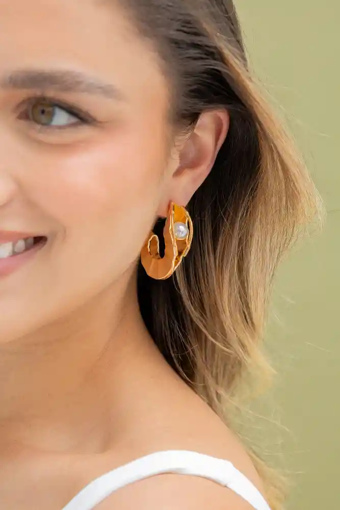 Aretes elaborados en Acero con baño de oro de 24k y perla. Incluye: 1 par de aretes ondulados. Recibe con tu compra una FLORIBAG gratis, para que guardes por separado tus accesorios. Hecho a mano en Colombia. * Ten presente que algunas de las imágenes pueden estar ambientadas con otros productos que se venden por separado.