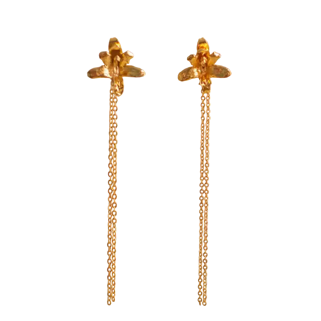 Los aretes Orquidea Maxilaria Cadena fusionan la belleza exótica de esta orquídea con la sutileza de finas cadenas doradas. La Maxilaria simboliza fuerza delicada y feminidad audaz, expresadas en una caída elegante que recuerda al largo aproximado de 10cm. Perfectos para llevar en ocasiones especiales o dar un toque sofisticado a tu estilo diario. Cada pieza conserva la esencia única de la flor natural, con ligeras variaciones que las hacen irrepetibles. Elementos: Orquídea Maxilaria Técnica: Fundición orgánica Hecho a mano en Colombia