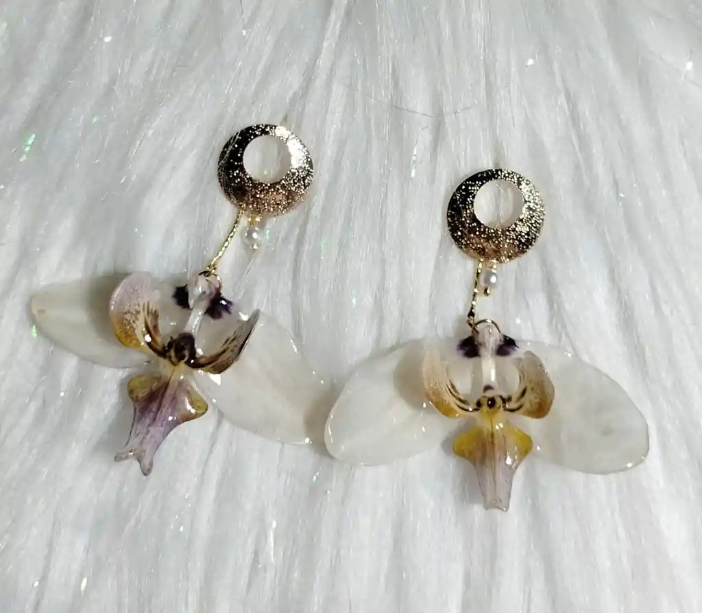 aretes hechos con orquideas naturales, en este caso orquidea phalaenopsis, un proceso totalmente manual hecho con amor y dando como resultado accesorios que llevan vida en ellos!