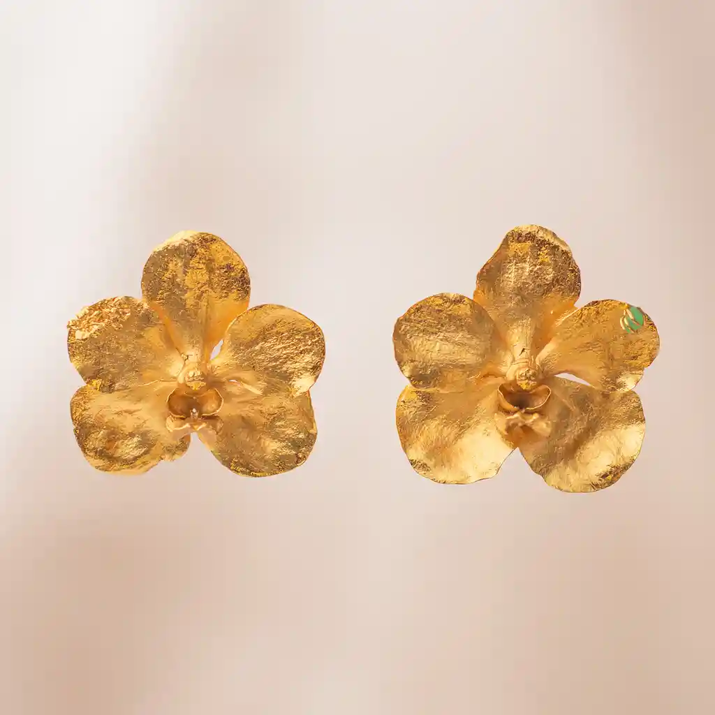 Estos aretes inmortalizan la grandeza de la Orquídea Vanda, capturando su silueta expansiva y cada detalle de su textura orgánica bajo un baño de oro. En esta edición Maxi, una esmeralda genuina se anida discretamente en un pétalo, aportando un destello de color verde profundo que celebra el lujo colombiano. Es una pieza statement diseñada para momentos donde tu estilo es el protagonista. Su volumen evoca poder y sofisticación, ideal para galas o eventos especiales donde la joya cuenta una historia de naturaleza indomable y artesanía de autor. Nota: La naturaleza artesanal de estos aretes garantiza que cada par sea único en su forma y detalle.