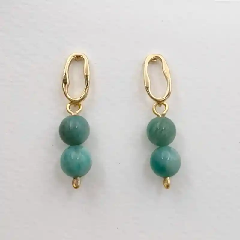 Aretes de la marca Caroco, con un óvalo ondulado dorado y 2 piedras Amazonita naturales de 6mm. El largo total de los aretes es de 2,5cm. Se entrega empacado para regalo. Material: bronce bañado en oro de 18k. Producto con garantía por fallas de fabricación. Recomendaciones de cuidado: Mantén tus joyas separadas unas de otras para evitar que se enreden y se rayen. Evita el uso de forma de directa de químicos como perfumes, cremas y productos de limpieza. Guarda tus accesorios limpios en un lugar seco y lejos del sol y la humedad.
