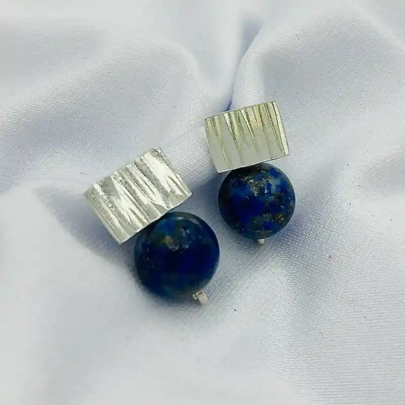 Aretes Caroco, con piedra Lapislazuli natural de 8mm de diámetro, bajo una barrita de plata con textura de rayas martilladas. Son aretes rígidos de 1,6cm. de largo total.