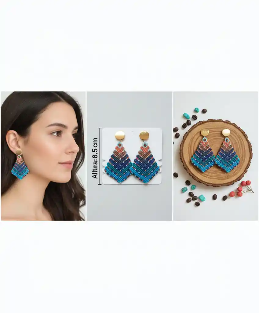 ✨ Aretes Piramidal Azul ✨ Un diseño único para mujeres que aman lo artesanal y lo auténtico. Te presento unos aretes tejidos cuidadosamente en hilo encerado, combinando tonos terracota, café, azul y verde azul que evocan la armonía entre tierra y cielo. Su forma piramidal realza la geometría y la elegancia del diseño, mientras que el topo en ensamble de latón dorado de 15 mm , su diseño piramidal de 8.5 cm de altura, aporta un toque moderno y sofisticado. Son livianos y perfectos para darle a tus outfits un estilo boho–chic, natural y lleno de personalidad. 🌿 Hechos a mano con dedicación. 💙 Colores que conectan con la naturaleza. ✨ Un accesorio que destaca en cualquier ocasión. ¿Lista para llevarte una pieza artesanal que habla por ti?
