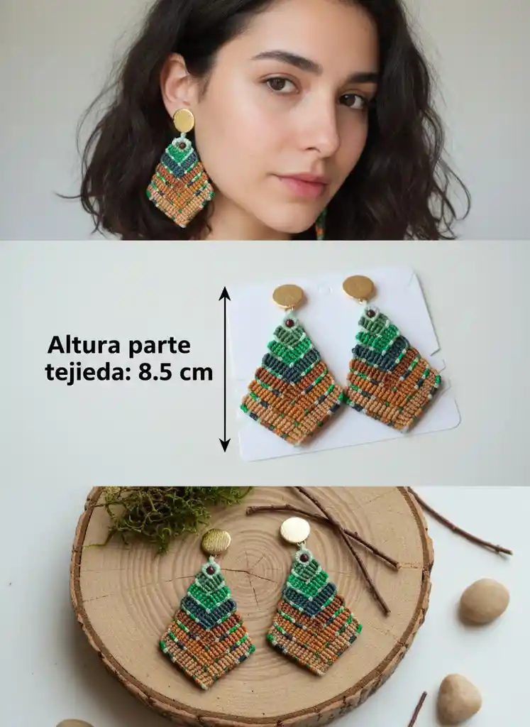 ✨ Aretes Piramidales Verde Miel ✨ Artesanía que resalta tu estilo natural. Estos aretes están tejidos a mano en micro macramé con hilo encerado de alta calidad, combinando tonos verde y miel que evocan la frescura de la naturaleza y la calidez de la tierra. Su diseño piramidal de 8.5 cm de altura estiliza el rostro y aporta un toque único a cualquier outfit. El topo en ensamble de latón dorado de 15 mm añade elegancia y brillo, logrando un equilibrio perfecto entre lo artesanal y lo moderno. Son livianos, resistentes y diseñados para uso diario. 🌿 Hechos a mano ✨ Colores naturales que combinan con todo 💛 Livianos y duraderos Dale vida a tu look con una pieza auténtica y hecha con amor. ¡Agrégalos al carrito y recíbelos en casa!