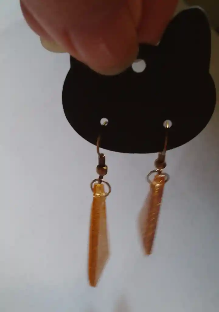 Lindos aretes hechos en resina, colgante en forma de triangulo color dorado brillante, ideal para tu uso o para regalar.