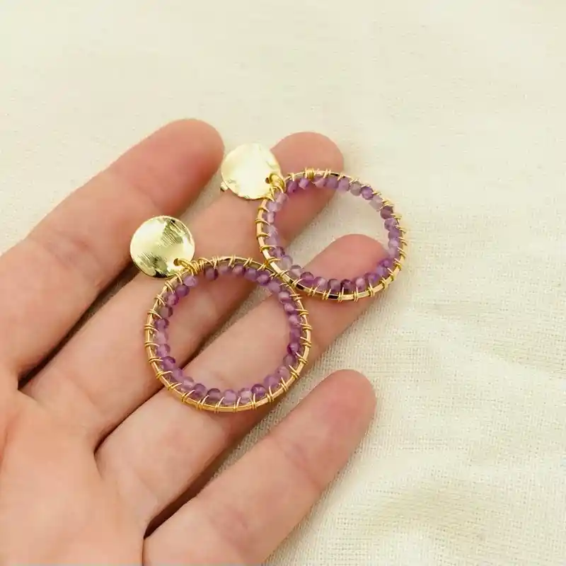 Aretes de la marca Caroco: ¨SOL morado¨ círculo grande entorchado a mano con piedras naturales colgando de un disco rayado con curvas. EL largo total de los aretes es de 4,3cm. Se entrega empacado para regalo. Material: bronce bañado en oro de 18k. Producto con garantía por fallas de fabricación. Recomendaciones de cuidado: Mantén tus joyas separadas unas de otras para evitar que se enreden y se rayen. Evita el uso de forma de directa de químicos como perfumes, cremas y productos de limpieza. Guarda tus accesorios limpios en un lugar seco y lejos del sol y la humedad.