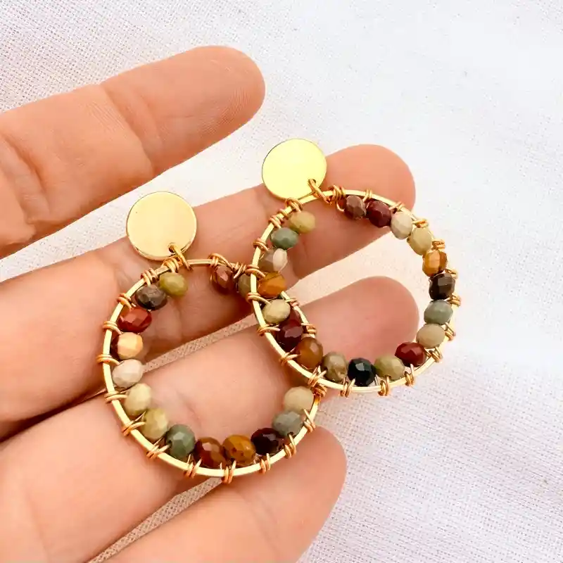 Aretes de la marca Caroco: ¨SOL Mix Tierra¨ con piedras Agatas naturales multicolor. Largo total de los aretes 4,2cm. Se entrega empacado para regalo. Material: bronce bañado en oro de 18k. Producto con garantía por fallas de fabricación. Recomendaciones de cuidado: Mantén tus joyas separadas unas de otras para evitar que se enreden y se rayen. Evita el uso de forma de directa de químicos como perfumes, cremas y productos de limpieza. Guarda tus accesorios limpios en un lugar seco y lejos del sol y la humedad.