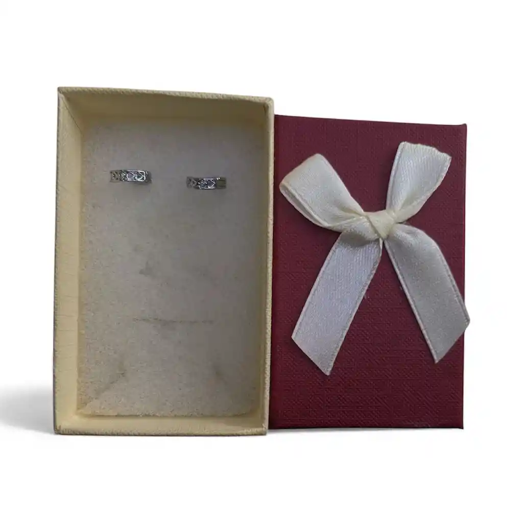aretes tipo candonga pequeña con diseño de corazones de rodio