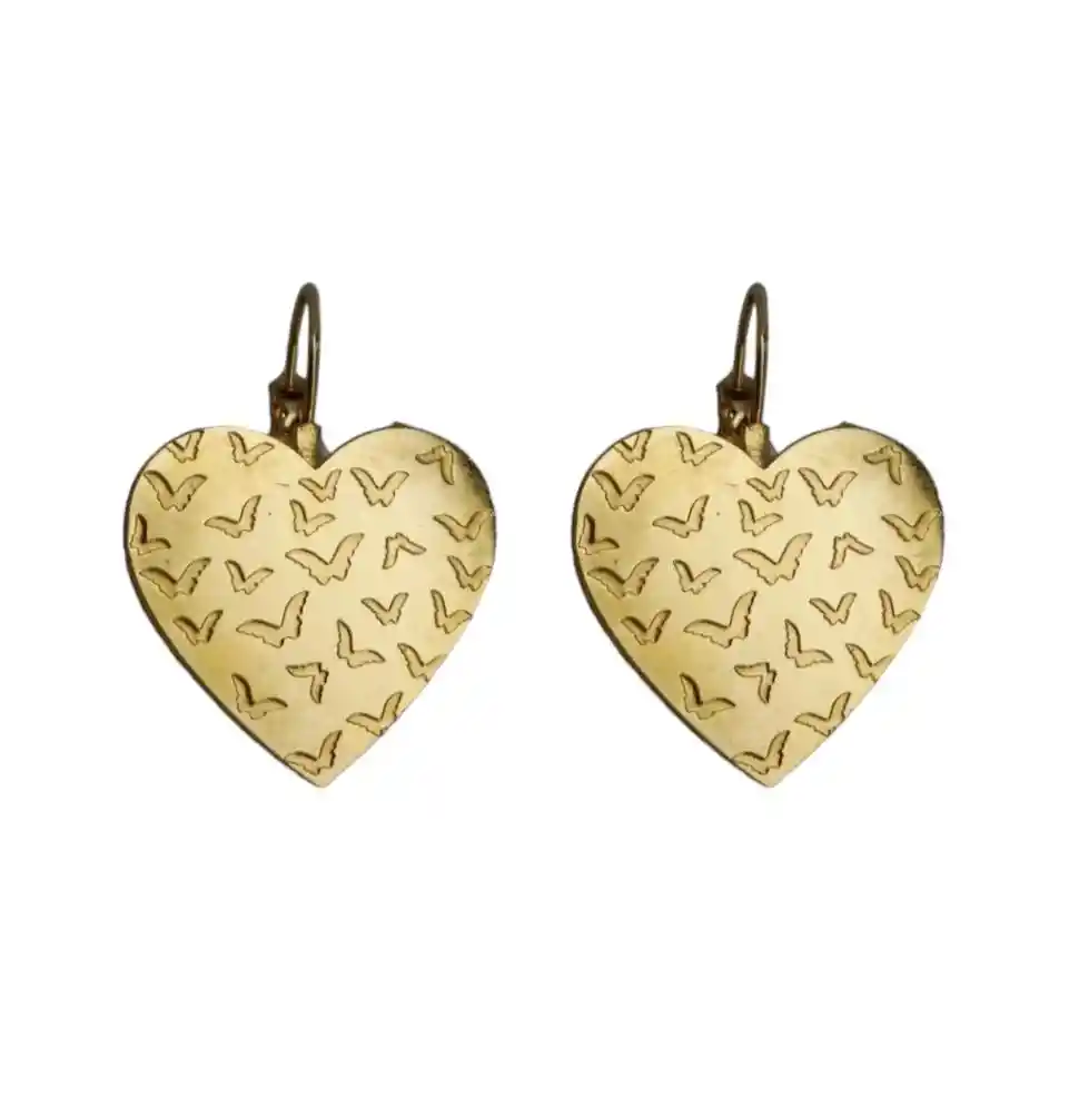 Presentación: Aretes Tipo Gancho Material: Acero Quirúrgico Color: Dorado Diseño: Arete diseño corazón con mariposas Producto Hipoalergénico. Caracteristicas: Es un material que no se oxida, no se oscurece con el tiempo, su tonalidad y brillo no se alteran. Es Antialérgico, la cantidad de níquel que tiene es residual por lo que en rarisimas ocasiones causa alergias. No necesita mantenimiento. Es un material duro, 1000 veces más duro que el platino y no se deforma.