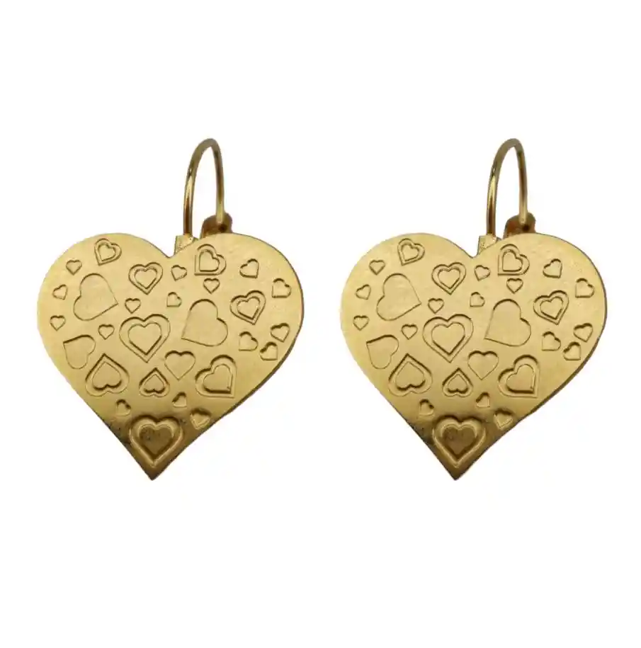 Presentación: Aretes Tipo Gancho Material: Acero Quirúrgico Color: Dorado Diseño: Arete diseño corazones Producto Hipoalergénico. Caracteristicas: Es un material que no se oxida, no se oscurece con el tiempo, su tonalidad y brillo no se alteran. Es Antialérgico, la cantidad de níquel que tiene es residual por lo que en rarisimas ocasiones causa alergias. No necesita mantenimiento. Es un material duro, 1000 veces más duro que el platino y no se deforma.