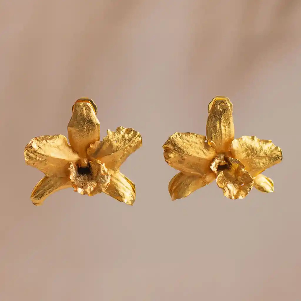 Estos aretes encapsulan la esencia vibrante y elegante de la orquídea Dendrobium Nobile, una flor conocida por su exuberancia y belleza. Cada pieza, cuidadosamente recolectada de nuestro jardín, ha sido inmortalizada mediante fundición orgánica, preservando las delicadas ondas que aportan movimiento y sofisticación a cualquier atuendo. Material: Bronce con baño en oro de 24k. Disponible también en versiones con baño en oro rosado y en plata ecológica. Diseño Artesanal: Cada arete es único, reflejando la singularidad de la orquídea Dendrobium Nobile. Elaborados a mano, estos accesorios fusionan la belleza natural con la artesanía de alta calidad. Exclusividad y Artesanía Sostenible: Producidos en cantidades limitadas, estos aretes destacan por su exclusividad y compromiso con la sostenibilidad, transformando elementos naturales en joyas de lujo responsable.