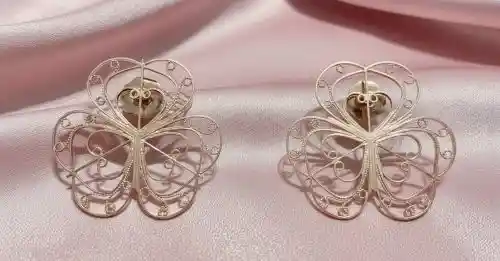 Aretes individuales tejidos destacan por su delicadeza y trabajo artesanal. Están elaborados con finos hilos metálicos entrelazados que forman una figura simétrica inspirada en una flor de una flor tres pétalos, con detalles curvos y espirales que aportan un aire romántico y sofisticado. Su diseño ligero y abierto permite apreciar cada trazo del tejido, creando una pieza elegante, femenina y muy versátil. El acabado en tono Oro rosado resalta su brillo sutil, ideal para complementar looks delicados o darle un toque especial a cualquier ocasión.